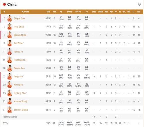 中国队阵中五人得分上双,充分展示了雄厚的整体实力。胡金秋20分12篮板两双,廖三宁16分,赵继伟14分,贺希宁12分,赵睿10分。日本队则由渡边雄太拿下13分,富永启生14分,归化球员科克12分,西田优大14分。