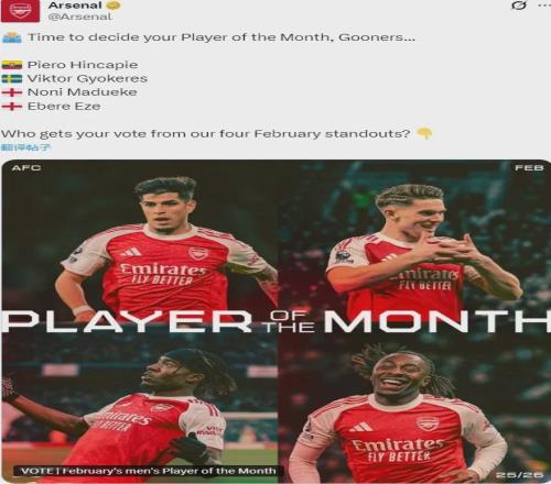 官方:阿森纳公布了队内2月份最佳球员候选,包括埃泽、哲凯赖什、因卡皮耶和马杜埃凯。