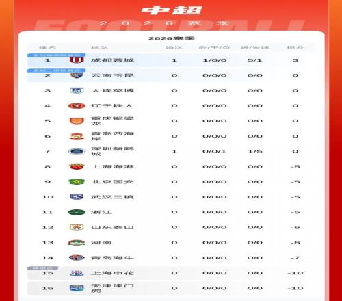 随着揭幕战结束,2026 赛季中超积分榜也完成首次更新,格局十分特殊。成都蓉城凭借大胜暂时登顶积分榜榜首,而惨败的深圳新鹏城依旧排在第 7 位,身后还有 9 支因处罚以负分起步的球队,成都蓉城甚至一度领先榜尾球队 13 分。
